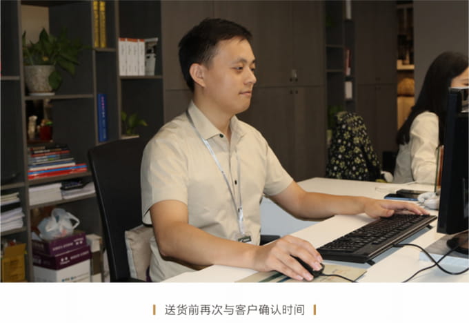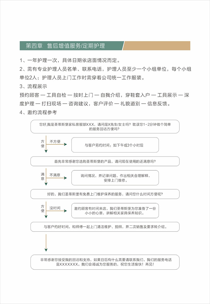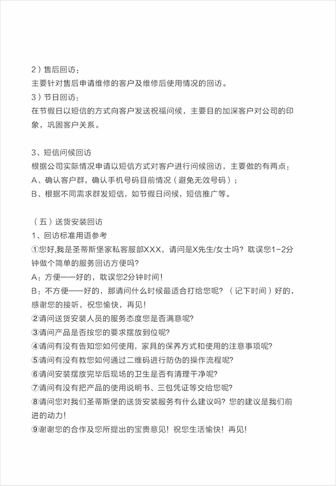 話術(shù)參考:“**先生/女士您好,我是圣蒂斯堡的售后服務(wù)人員**,您購買的圣蒂斯堡家具已經(jīng)全部到貨了,送貨安裝大約需要**時(shí)間,請問您這邊什么時(shí)候方便我們上門送貨安裝呢?”同時(shí)要了解送貨小區(qū)的電梯、樓道、入戶門的尺寸等,提前做好準(zhǔn)備,避免意外情況。最后確定送貨時(shí)間(安裝所需要時(shí)長),并告知客戶安裝人員的相關(guān)信息,可加微信發(fā)送,并發(fā)送配送安裝流程說明。