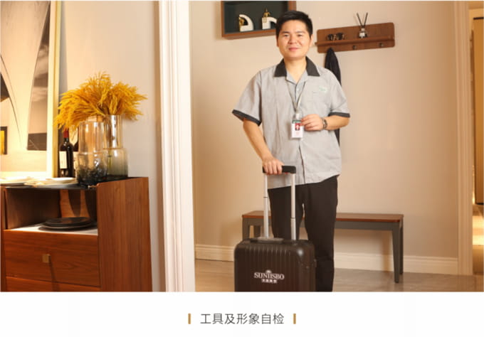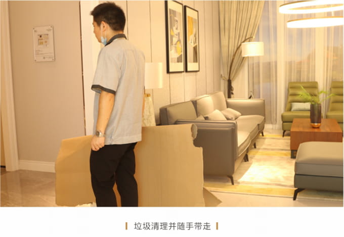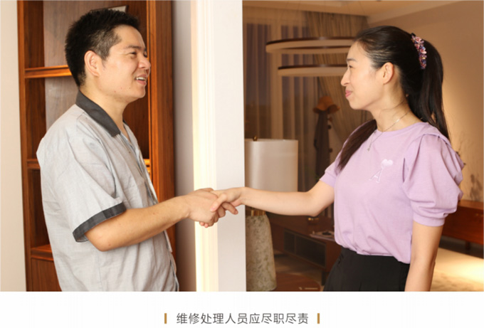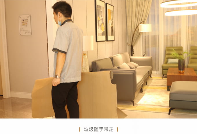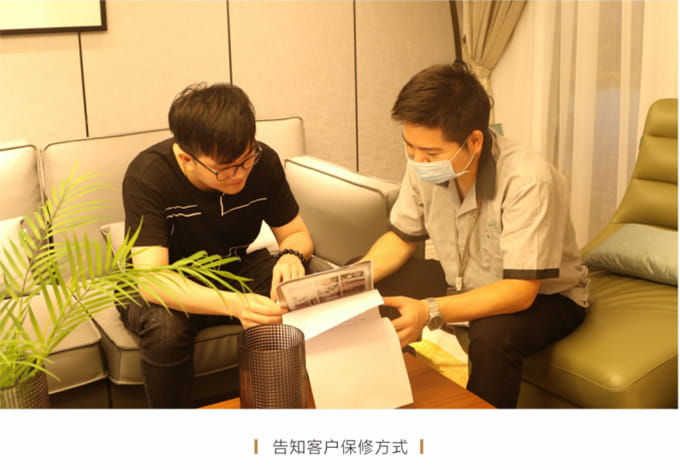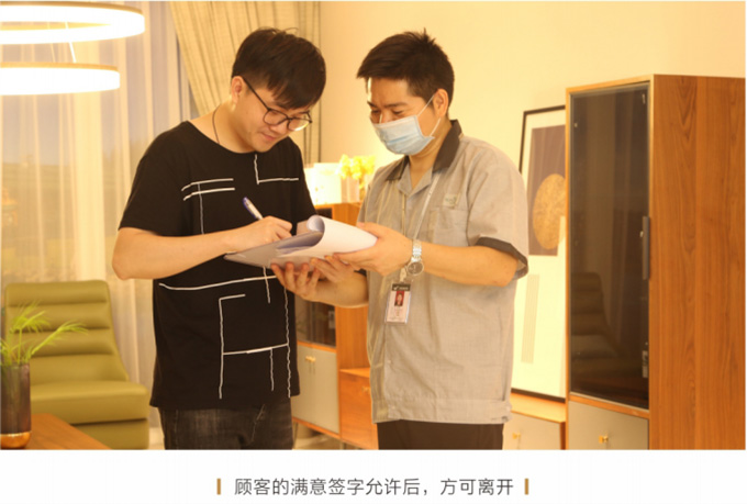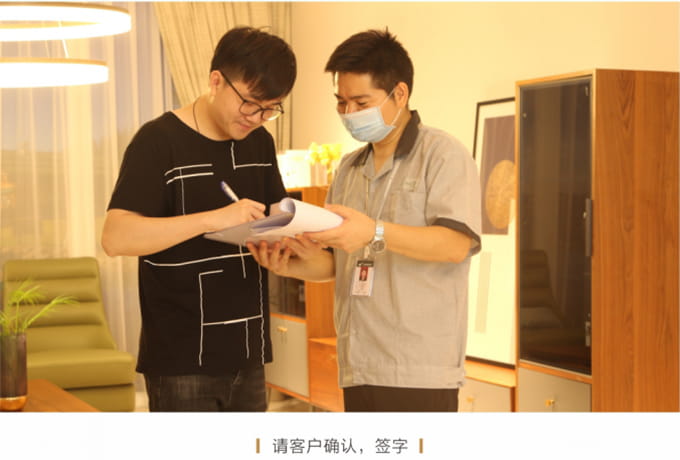產(chǎn)品處理完畢后必須一站式通檢,指導(dǎo)客戶使用,并將服務(wù)過程中產(chǎn)生的垃圾隨手帶走,家具維修完畢后,應(yīng)用毛巾將家具擦拭一遍,確保產(chǎn)品清潔。