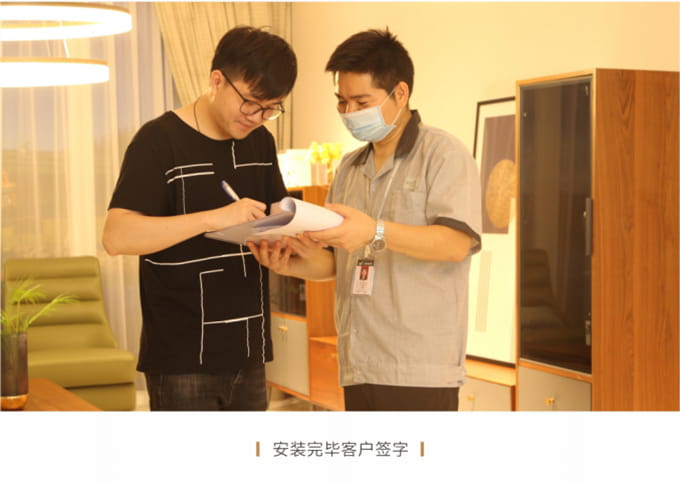 安裝并檢查完所有工作后,需與客戶清點(diǎn)并確認(rèn)產(chǎn)品,將所有帶電源的家具插上電源,告知客戶家具使用方法和功能及保養(yǎng)知識、注意事項(xiàng)等。所有帶功能的產(chǎn)品需演示給客戶看。例: