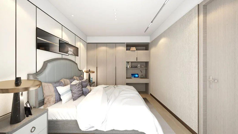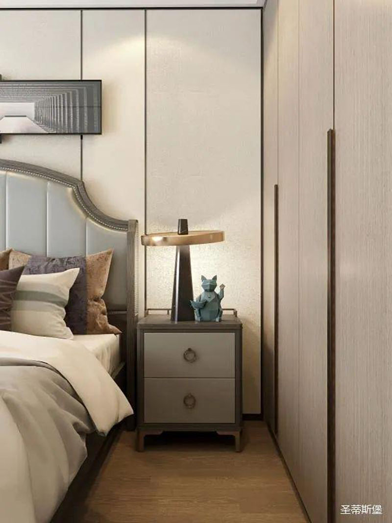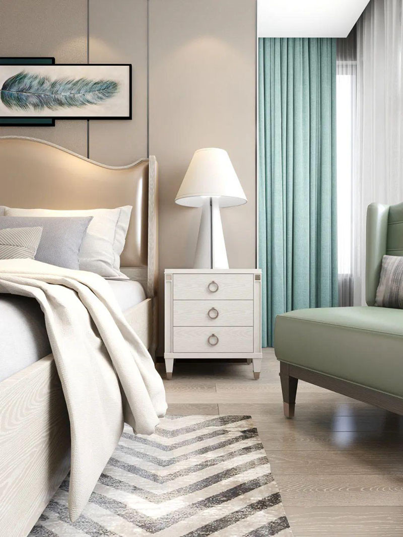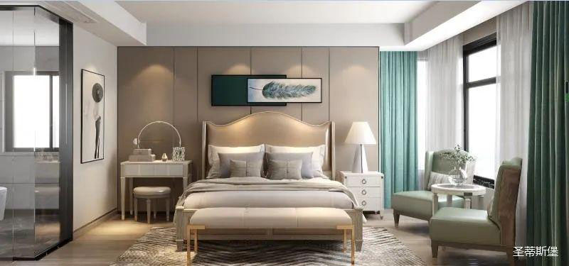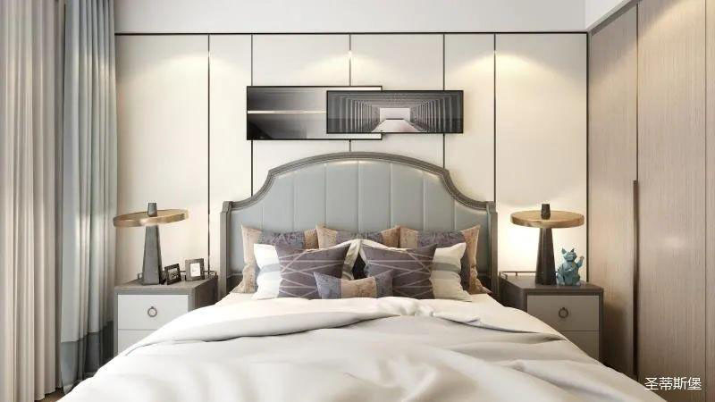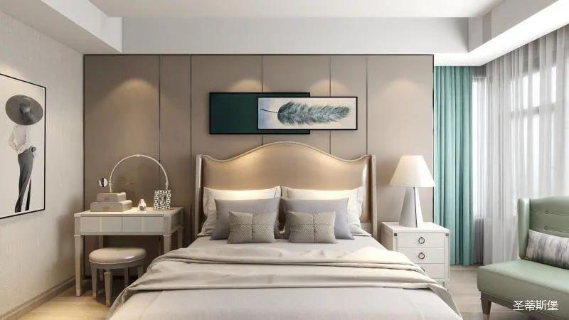 ▲次臥空間主要是以淺色為底調(diào),大面積的莫蘭迪色與淺色相平衡。極強(qiáng)線性裝飾畫(huà)帶來(lái)的延伸感讓視覺(jué)煥然一新。少許的金屬元素?cái)z入,瞬間提升了空間的精致度,將溫潤(rùn)雅致與時(shí)尚輕奢糅合在同一空間里,每一處都洋溢著浪漫的氣息。