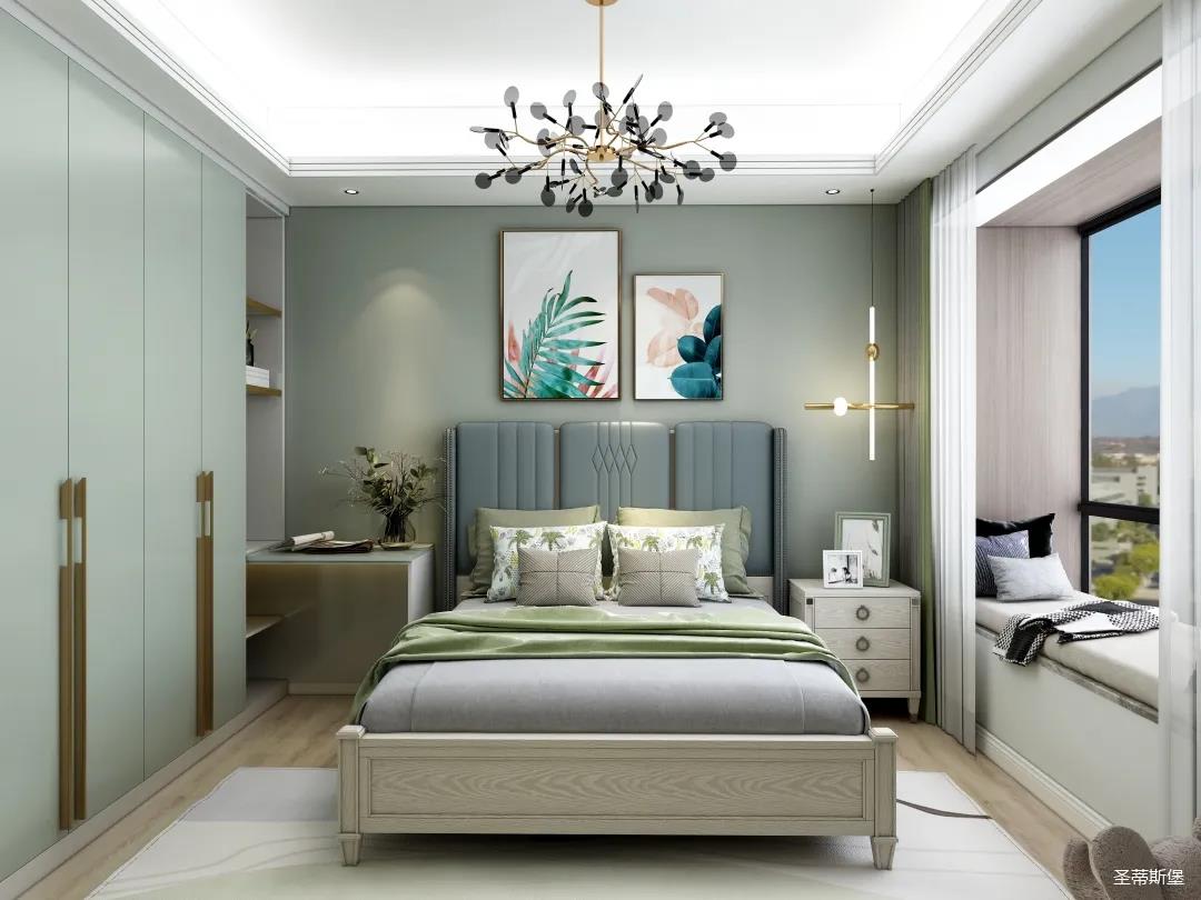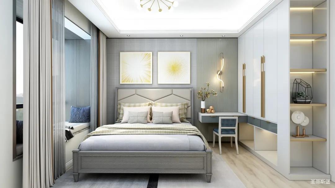 次臥的設(shè)計(jì)充滿治愈氣息,表姐打算讓兩位老人居住。莫蘭迪灰的實(shí)木感經(jīng)典再現(xiàn),沉穩(wěn)中透著時(shí)尚,流露出精致的美式格調(diào)。舍棄刻意繁復(fù)的設(shè)計(jì),簡約米白背景墻與床屏產(chǎn)生的視覺延伸,提升了空間的舒展性。金屬材質(zhì)的燈飾,以較強(qiáng)的白熾燈為主,輔助照明,將對兩位老人的關(guān)愛體現(xiàn)在細(xì)節(jié)中。