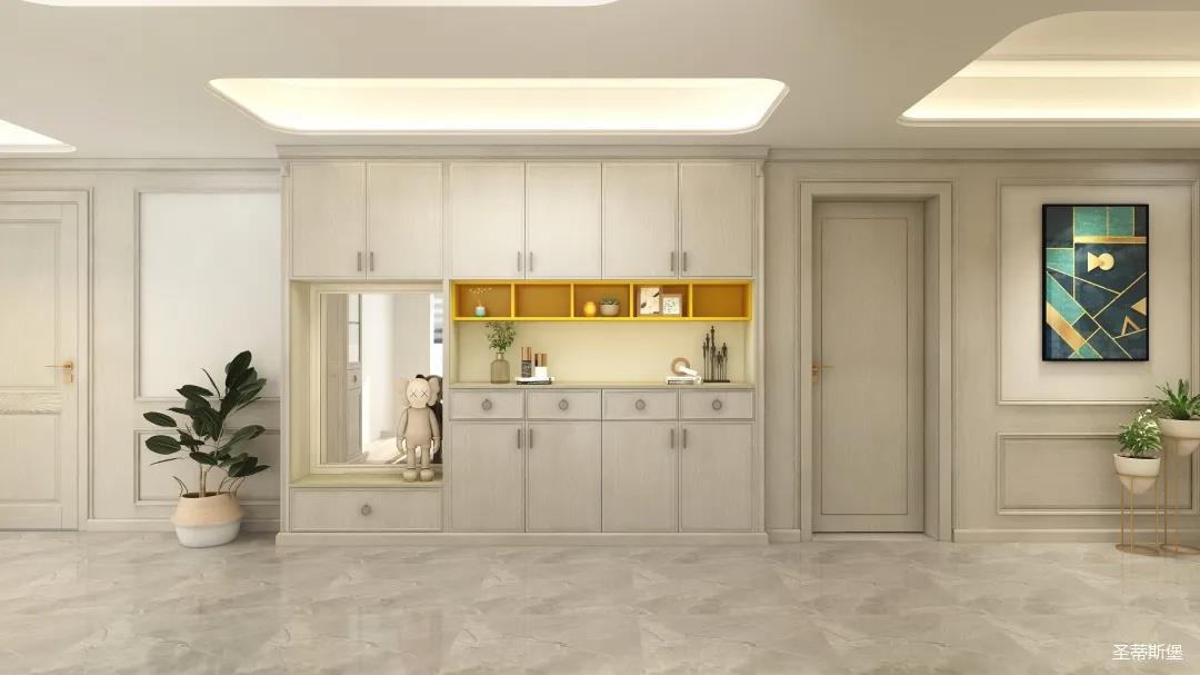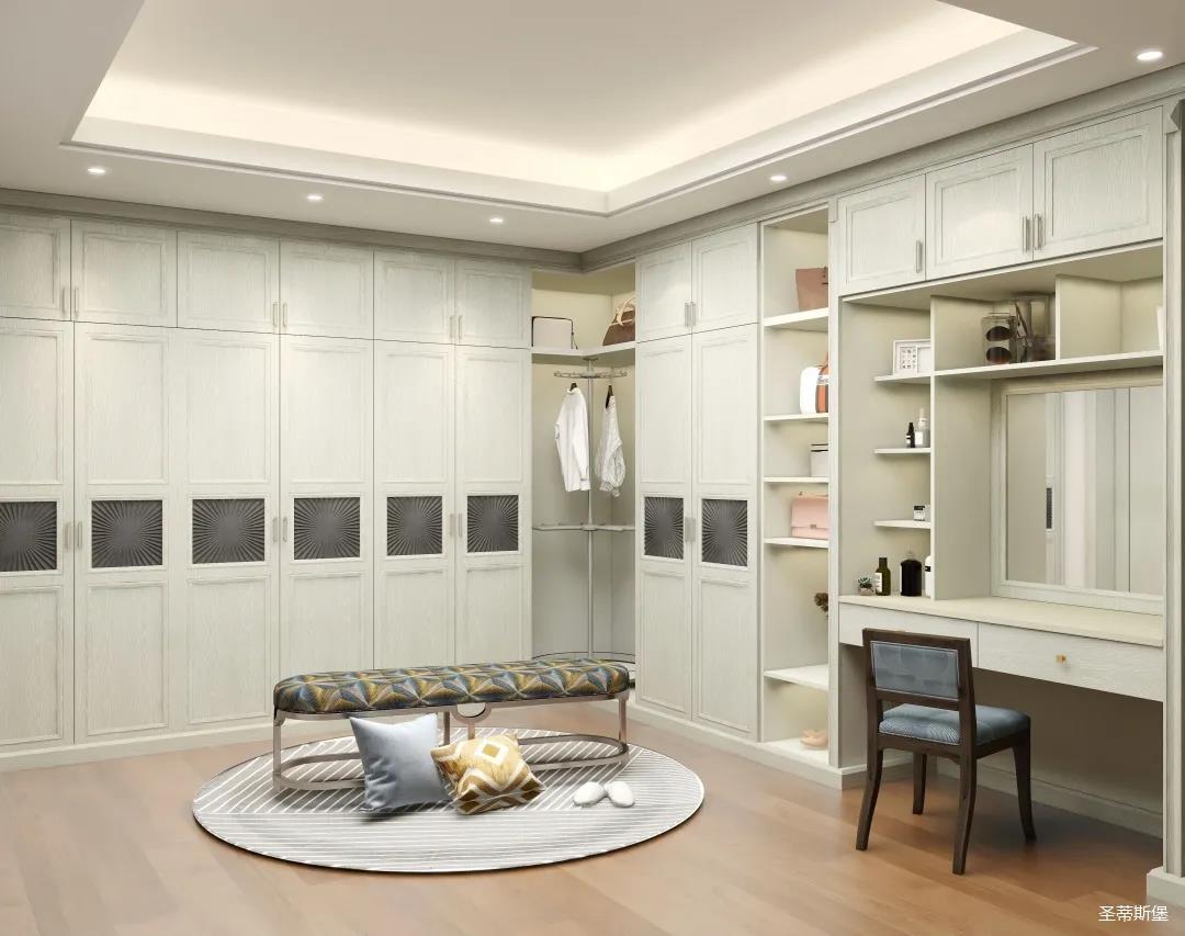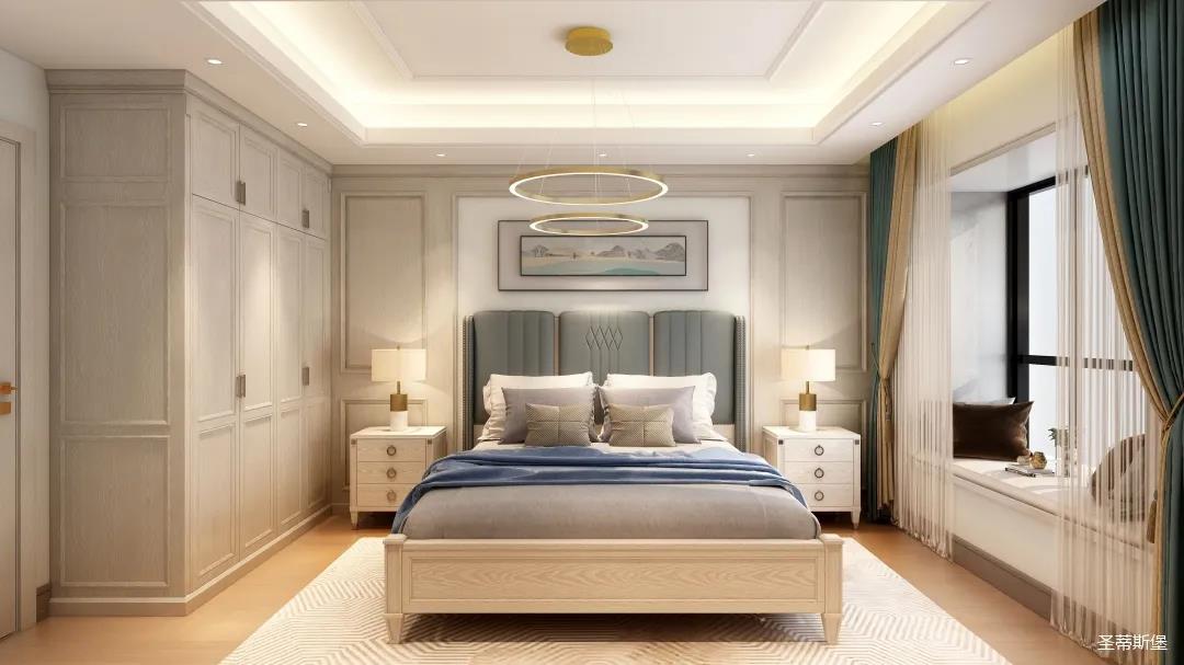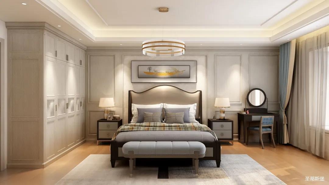 ▲業(yè)主喜歡低調(diào)輕奢的空間格調(diào),設(shè)計師從功能出發(fā),賦予空間舒適的感受,打造專屬的衣帽間,滿足業(yè)主日常買買買的儲物喜好。同時也將藝術(shù)元素融入美式現(xiàn)代風(fēng)格,利用空間的色彩、紋理、家具、配飾、光線等表達(dá)空間情緒,再以黃銅金屬加持,營造溫馨愜意的家居睡眠氛圍。