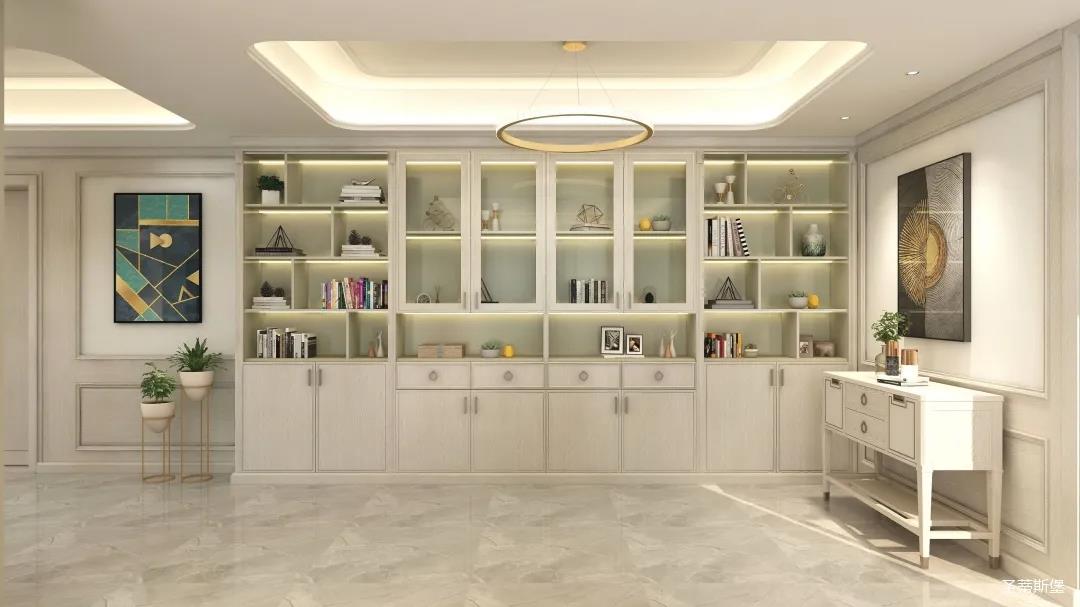▲?電視背景墻設(shè)計師完全根據(jù)業(yè)主家量尺所得,安裝的對稱裝飾柜,集裝飾美與實用性于一體,業(yè)主超喜歡收藏,設(shè)計師也完全滿足了業(yè)主對空間儲物的需求。