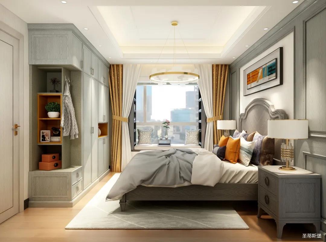 ▲室內(nèi)的環(huán)形水晶吊燈,讓空間明亮而高級,淡雅內(nèi)斂的洛卡灰,在些許愛馬仕橙的亮色點綴下,讓空間色彩跳脫又靈動。飄窗設(shè)計,使光線毫無保留的散落空間,臥室通過自然光線與實木的洗禮,充滿著溫暖陽光的氣息。