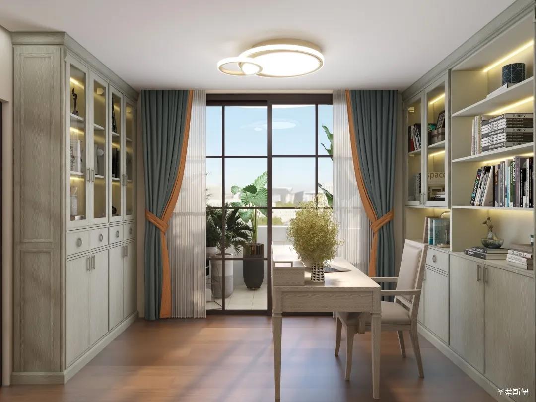 ▲書房設(shè)計不放過每一面墻,實木鋪滿整個空間,親近自然的靜謐感油然而生,陽光透過玻璃灑進來,落在地面上形成斑駁光影,一本喜愛的書、一杯咖啡、沉浸在閱讀的樂趣之中,時光荏苒、歲月靜好。