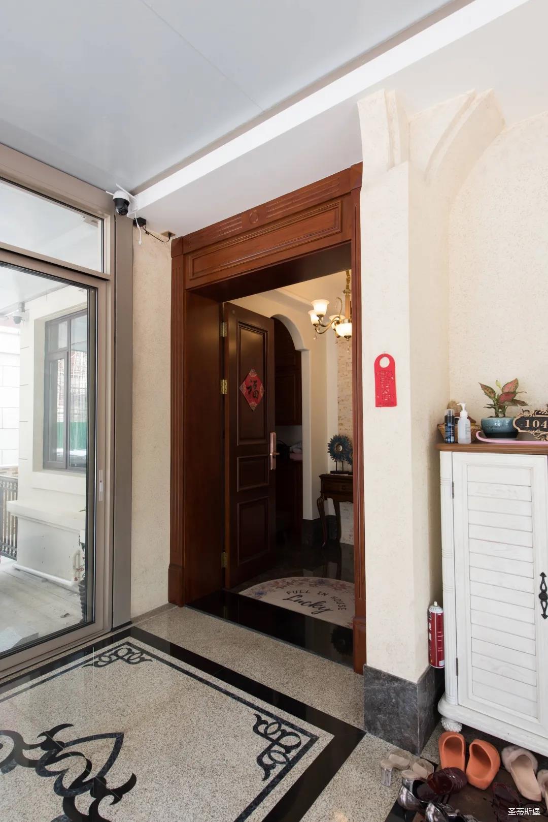 入戶玄關(guān)雙開門設(shè)計(jì),儀式感滿滿!地面定制的瓷磚貼花設(shè)計(jì),典雅又大方。核桃實(shí)木玄關(guān)桌,加上精致的擺件,經(jīng)典美式復(fù)古吊燈,不著痕跡的展現(xiàn)出居者對(duì)生活的激情,魅力吸睛,從入戶開始感受古典氛圍。