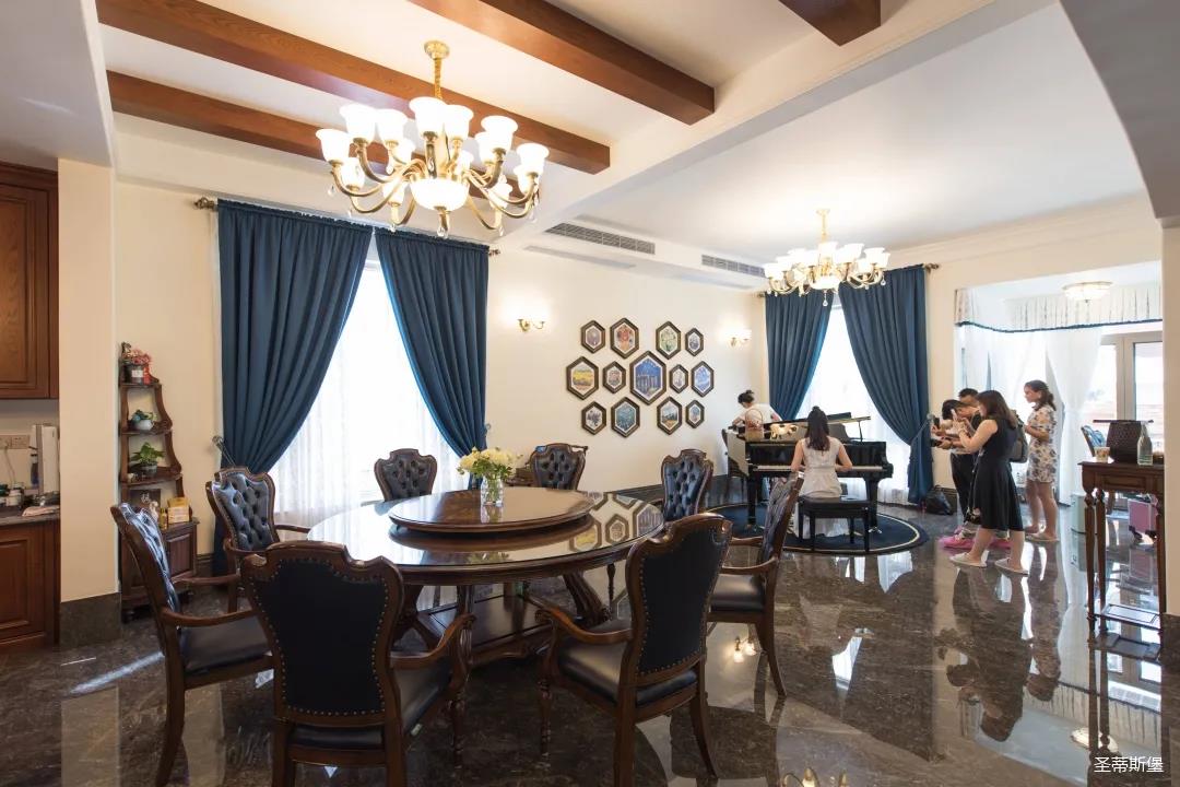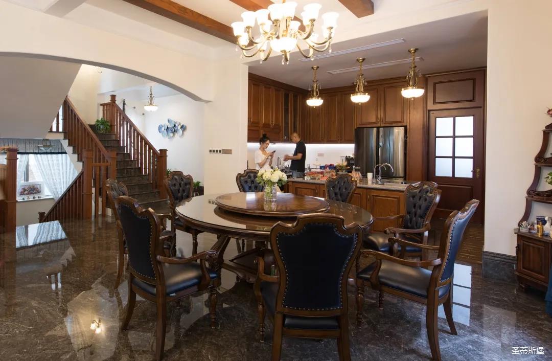 玄關(guān)進(jìn)入轉(zhuǎn)角處,以穩(wěn)重大氣實(shí)木為主色調(diào)的開放式中西餐廚空間,將一體化無隔斷設(shè)計(jì)貫徹到每個(gè)細(xì)節(jié),采用了親膚真皮質(zhì)感的餐椅,手工雕刻的曲線讓原本硬朗的空間變得格外優(yōu)雅,自上而下,構(gòu)成完整的美式空間氣度,在每天的生活點(diǎn)滴間,沉浸在美式風(fēng)情中,更加隨性舒適。