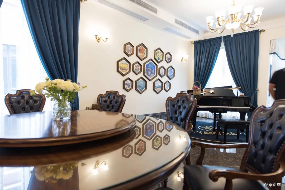 業(yè)主喜歡沉穩(wěn)的美式新古典風(fēng)格,整體統(tǒng)一的色調(diào),呈現(xiàn)了一種莊重的典雅感。醇厚的實(shí)木真皮沙發(fā),以古典的手法描繪出一種略帶復(fù)古的時(shí)尚奢華。一抹深藍(lán)迂回婉轉(zhuǎn)映照著空間的色系,明暗相對(duì),符合著現(xiàn)代審美,卻又不顯沉悶。轉(zhuǎn)角處的一臺(tái)復(fù)古唱片機(jī),還原了對(duì)音樂傾心的浪漫,抬起撥桿將唱針落下,隨著唱片的轉(zhuǎn)動(dòng)和音樂的響起,美好的一天就此開始。