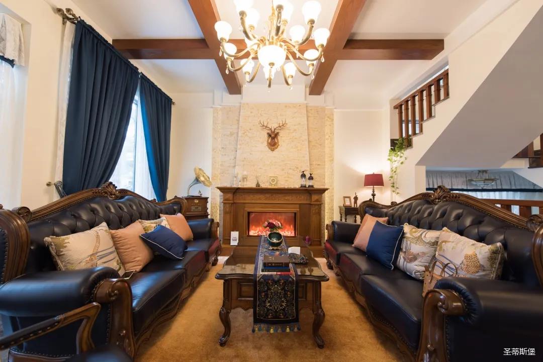 歐美實(shí)木吊頂設(shè)計(jì),與沙發(fā)茶幾上下呼應(yīng),相得益彰,提升了空間層次感。