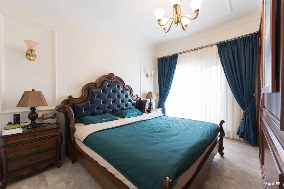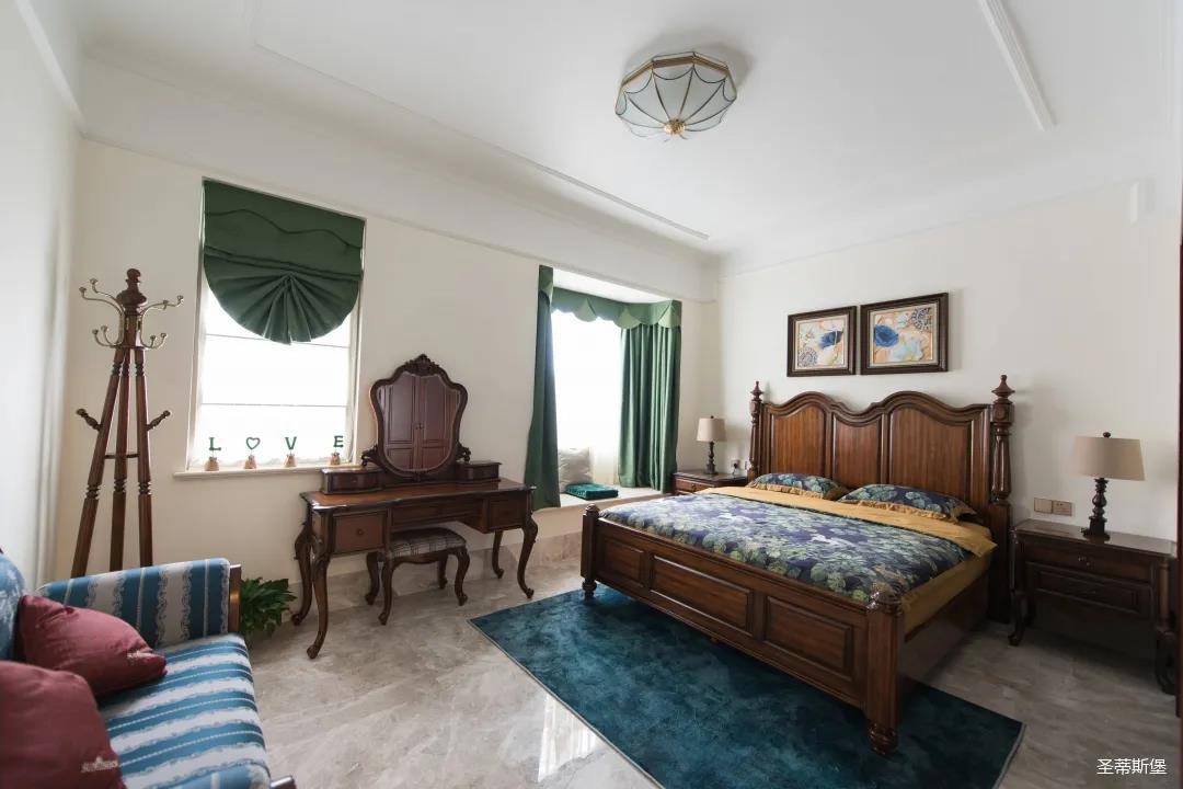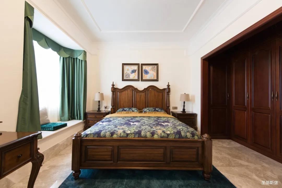 三樓是兩間臥房,每一間臥室都有自己的特定屬性。主人房端莊優(yōu)雅,雍容盡顯;墻面以簡(jiǎn)潔的美式石膏線修飾,波浪形的實(shí)木床屏上點(diǎn)綴著太陽形狀的手工雕花,宛如海平面上剛出升的太陽,讓整個(gè)空間色彩奔放。