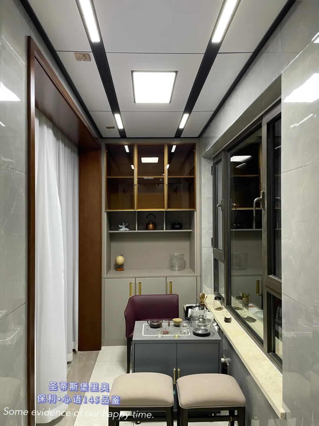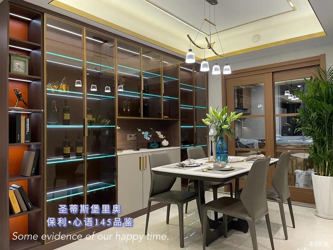 ▲餐廳一面及頂?shù)耐该鞴耋w,以簡練的金屬線條分割出收納空間,讓立面視覺更顯精致干凈。餐邊柜設置了臺面、全玻璃展示區(qū)以及隱藏收納區(qū),滿足了日常生活中多樣的收納需求。