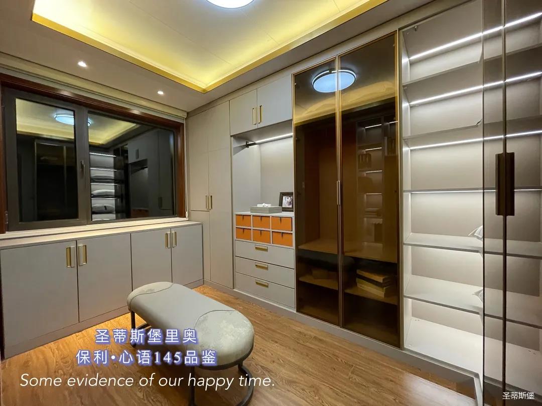 ▲衣帽間是用一間房改造的,衣柜開放式的布局處理,不但釋放了空間的狹隘,也營造出了具有觀賞性的空間格局,淺灰色調打造柜體基底,凝練出現(xiàn)代簡約的生活質感。柜體中安裝感應燈帶,光線流瀉其中,襯托出材質的自然肌理,溫潤細致的實木與剛硬冷冽的低奢金屬相互交織出一個極具質感的儲物空間。