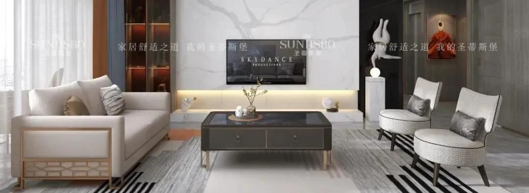 ▲客廳以灰色為主調,電視背景墻采用拼接大理石搭配實木闌珊,與對立墻面形成撞色處理,既可以加深空間層次感,也提升了空間明亮度。一字型真皮沙發(fā)與實木電視柜中和了大空間的空曠,打造出一個談心敘話的和諧空間。
