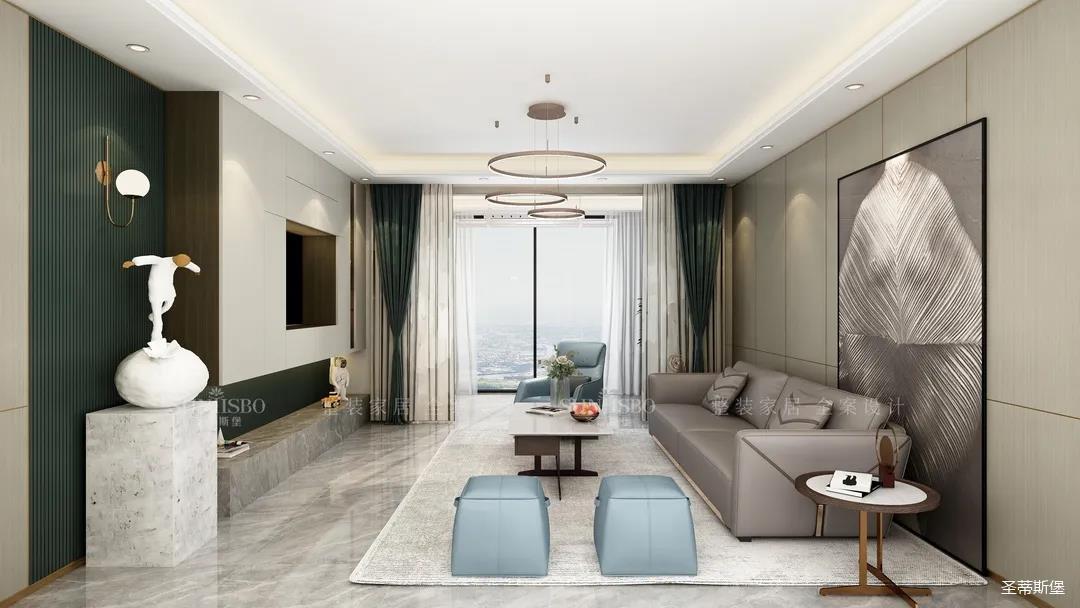 客廳色彩搭配極為巧妙,淺色木飾面與深綠木欄柵搭配讓空間高級感隨即上升,墻面的虛實裝飾畫作為點睛之筆,讓看似空曠簡單的沙發(fā)背景墻多了份藝術(shù)氣息。