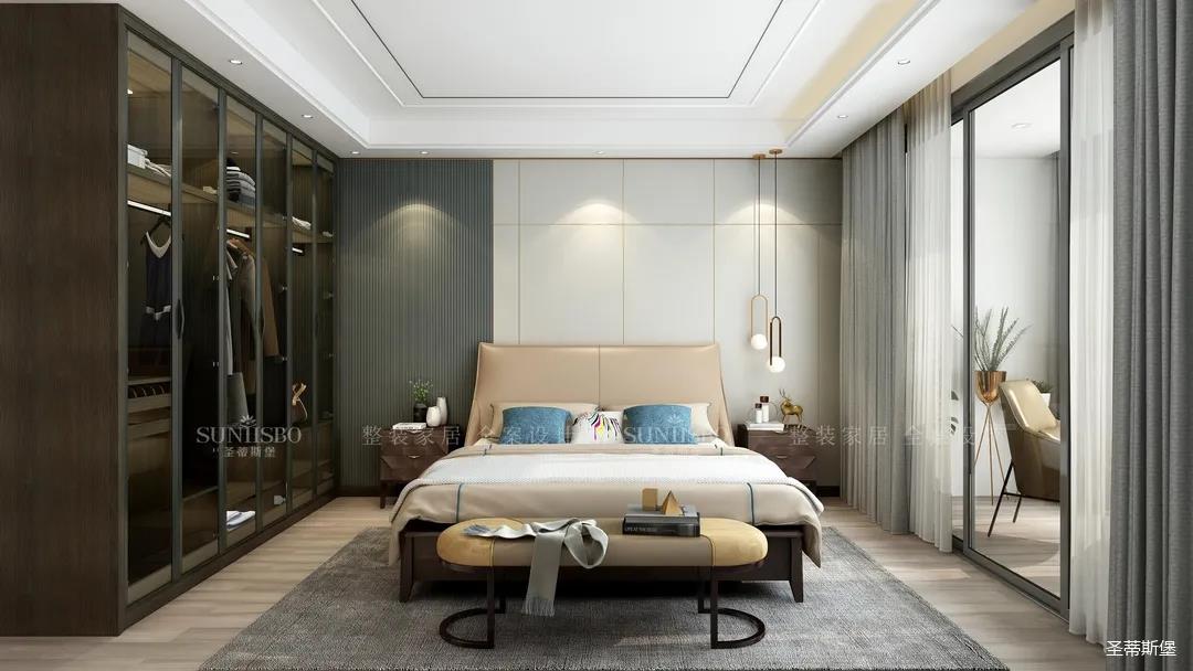次臥的對稱極簡主義讓人擁有奢華、簡約居家質(zhì)感。倒梯形的幾何床頭柜和奢華的水母造型床頭燈,都讓空間散發(fā)著華貴的魅力。嵌入式的立面衣櫥,運用不同的材質(zhì)將極簡的協(xié)調(diào)效果達到極致,收納空間層層分區(qū),讓每一件物品都有跡可循。