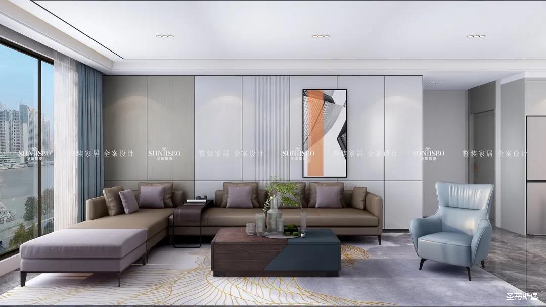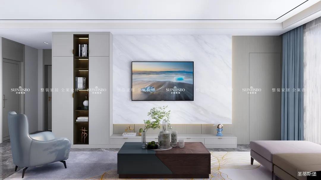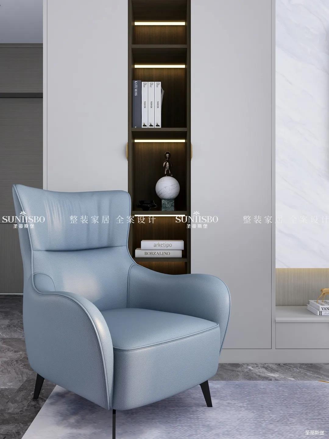 優(yōu)雅淺灰L型定制柜與紋理清晰的大理石組合電視墻,滿足了業(yè)主審美與實用的雙向需求。一張淡藍色的休閑椅,讓業(yè)主能感受到亮麗明艷色彩之外的獨特,低調不張揚,卻在溫潤中傳遞出色彩的力量。通過紋理清晰的護墻為底,為柔和優(yōu)雅的靜態(tài)客廳增添了層次感十足的空間律動。