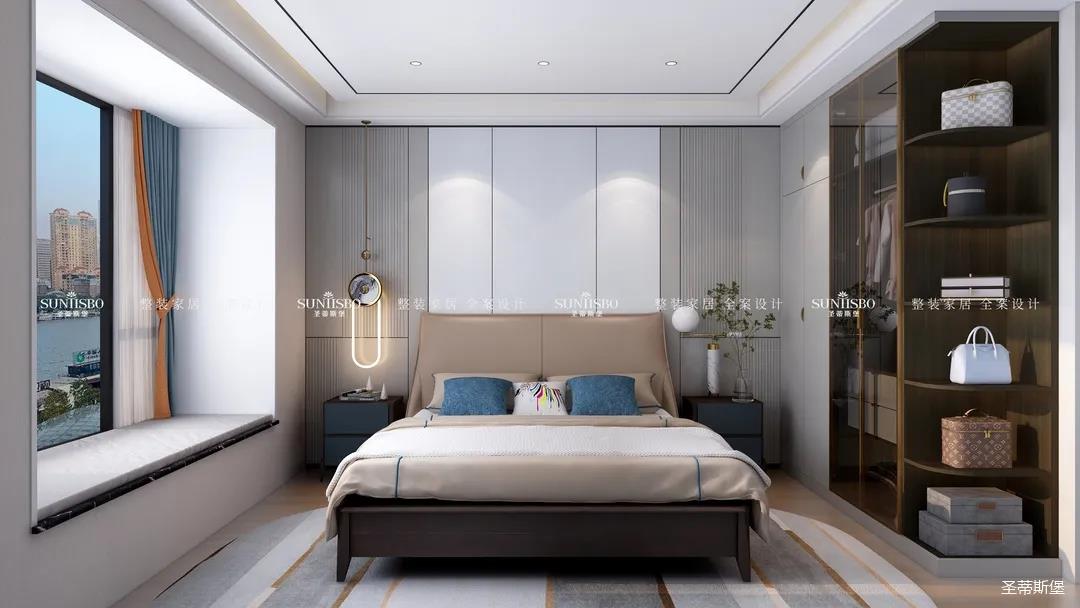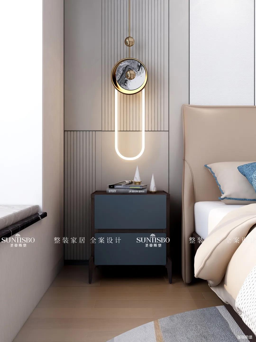 臥室把自然光線納入空間。穩(wěn)重的淺咖色床屏搭配柔和的灰白護墻,渲染了空間去繁從簡的設計。品質精致的床品面料觸感自然柔軟,真皮質地的家具匹配空間氣質,為業(yè)主營造了舒適愜意的休憩空間。