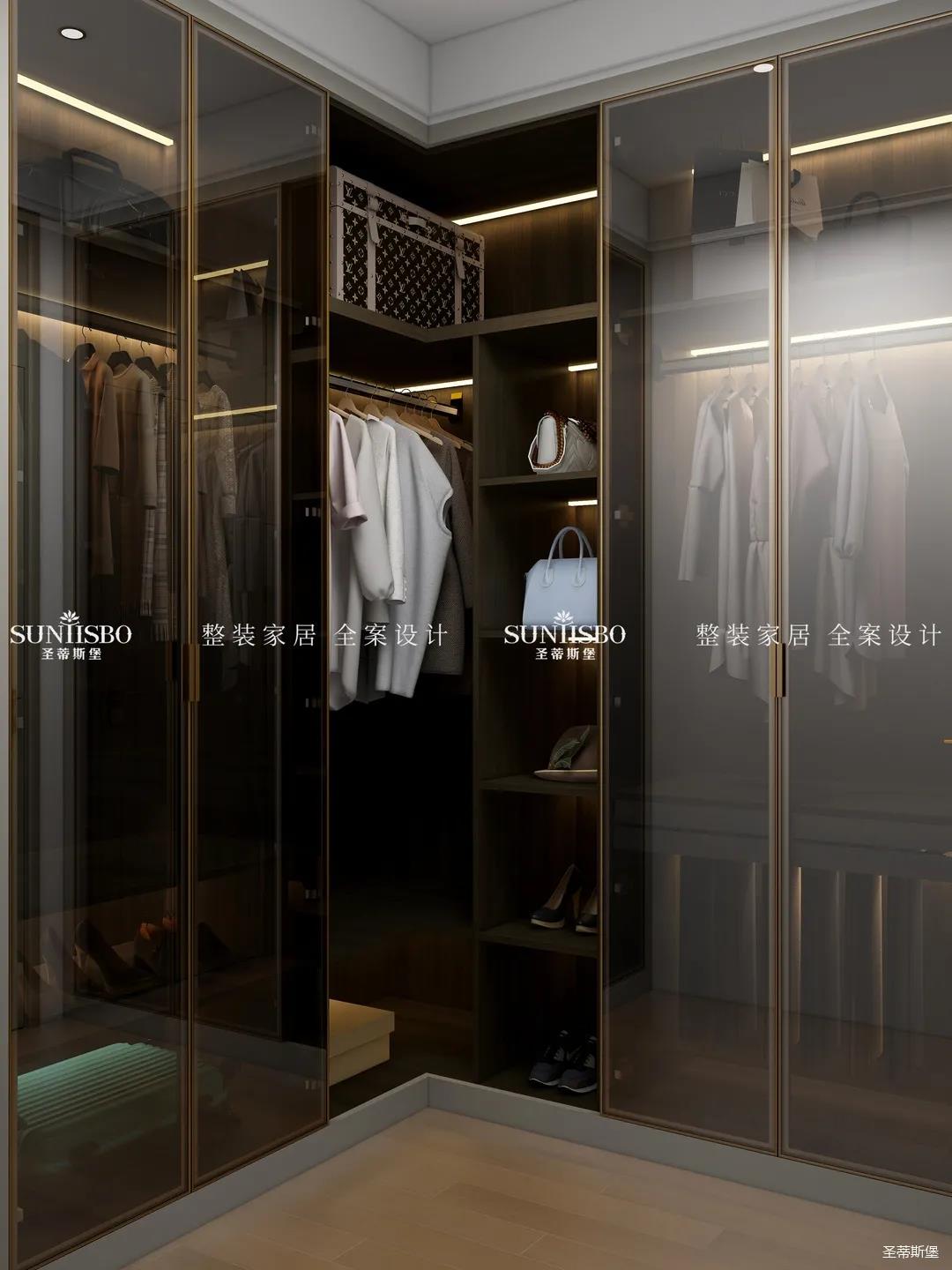 L型衣帽間采用了玻璃與實木組合,用時尚的煙熏色打造純凈質感,避免了全實木柜門的無趣。人性化的分區(qū)包含了鞋架、褲架、首飾收納等,將衣帽間的實用性靈活設計成業(yè)主的收納習慣。