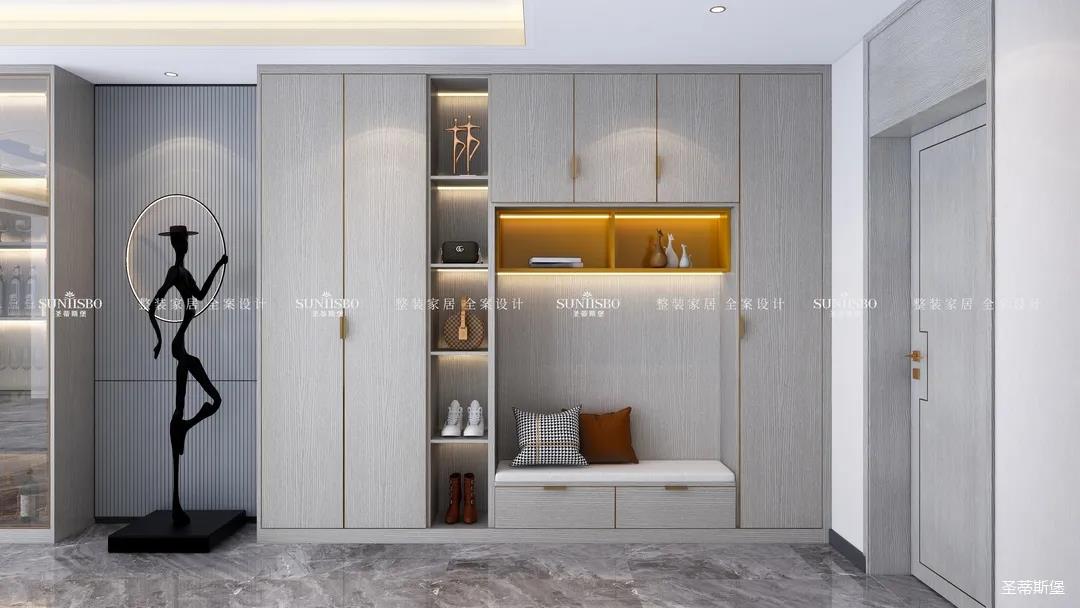 玄關(guān)極具人性化設(shè)計(jì),一字型定制柜體沿邊而立,打破了傳統(tǒng)的設(shè)計(jì)模式,讓入戶動(dòng)線更流暢。高級(jí)灰+明亮黃作為時(shí)尚圈中佼佼者,讓空間在沉穩(wěn)與雀躍的碰撞中融合,令空間在沉穩(wěn)的氣息中注入一絲活躍,帶來一種驚艷人心的美感。