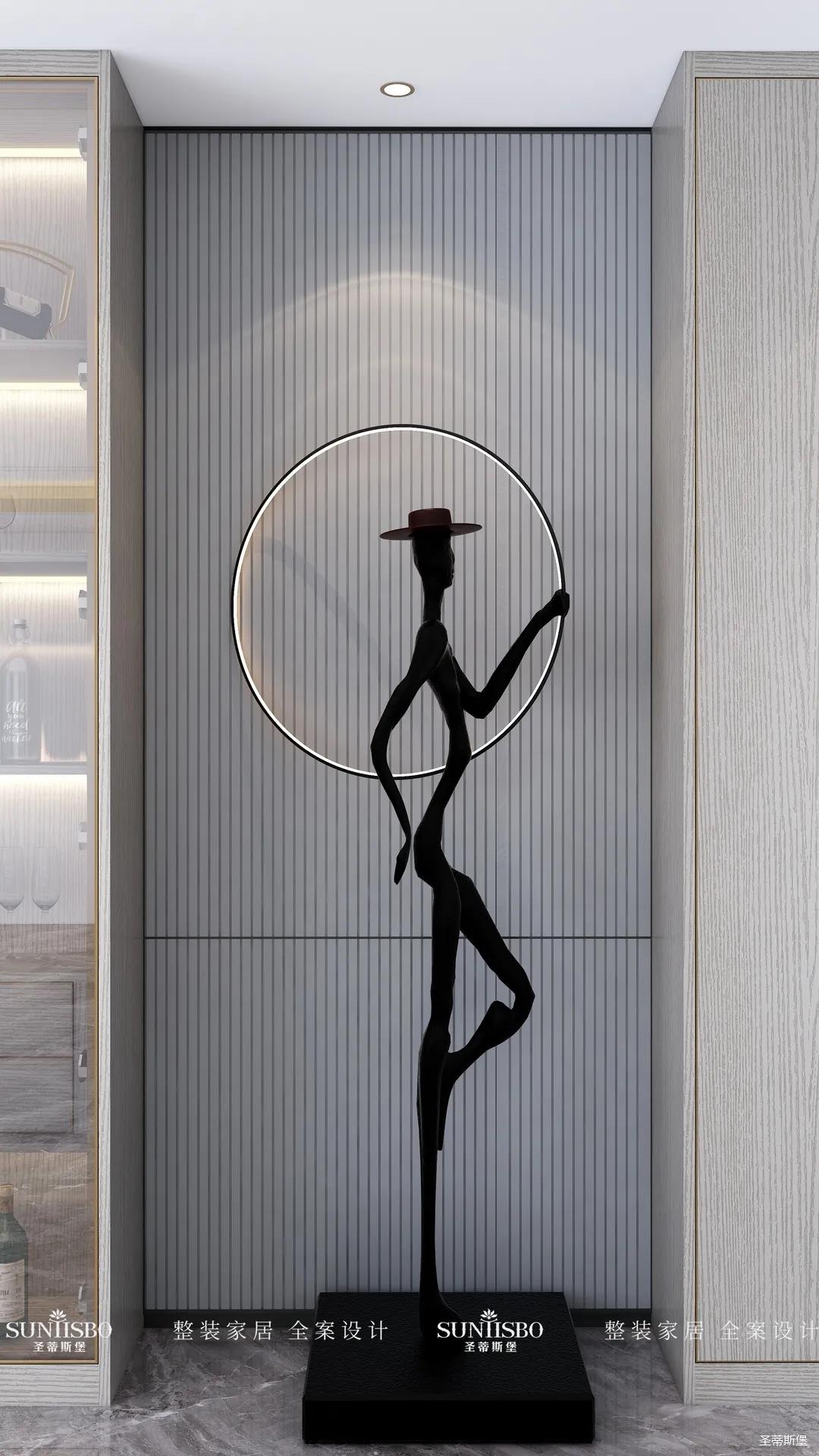 造型獨(dú)特的人形裝飾佇立在過道與玄關(guān)之間,充滿優(yōu)雅氣息。淺灰的線性紋理背景搭配黑色的造型,彰顯著居者時(shí)尚的生活品位。