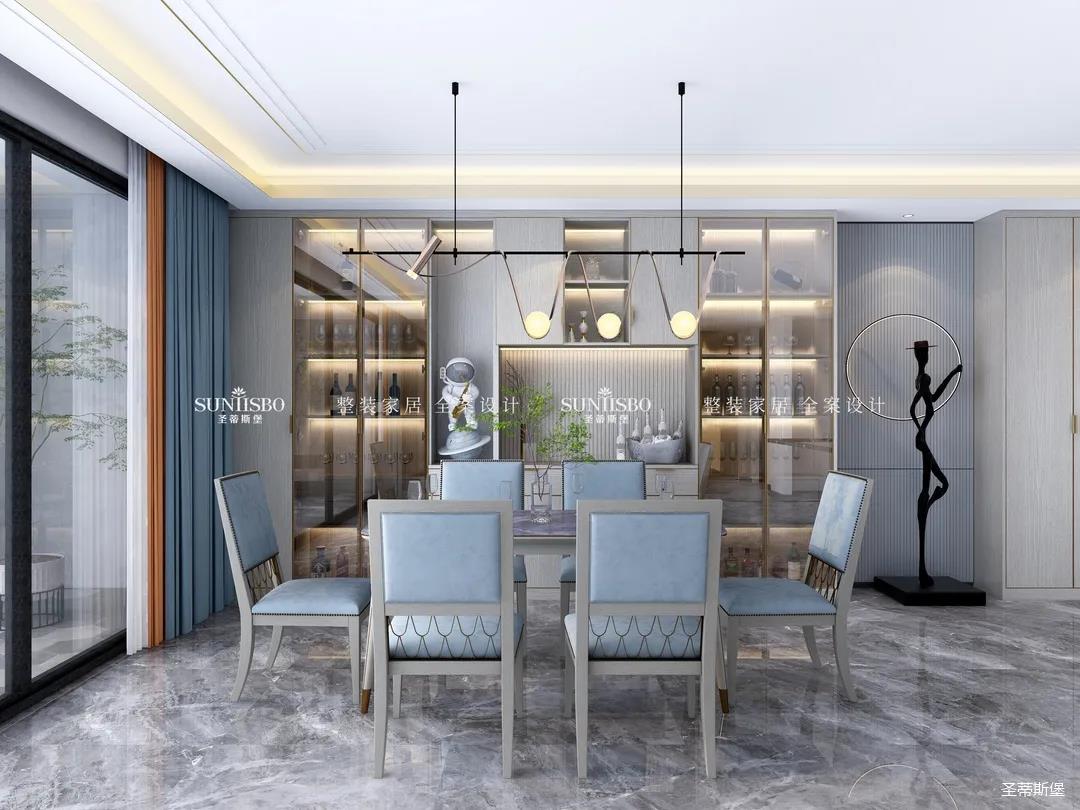 從優(yōu)雅中款款而來,高級(jí)灰與霧霾藍(lán)的冷靜色調(diào)勾勒出一個(gè)高貴而又摩登的用餐空間。設(shè)計(jì)師從玄關(guān)直入打造一排定制柜體,包含了玄關(guān)和餐邊柜,藝術(shù)燈形與時(shí)尚餐椅弧形相呼應(yīng),營(yíng)造出溫暖柔和的用餐環(huán)境。