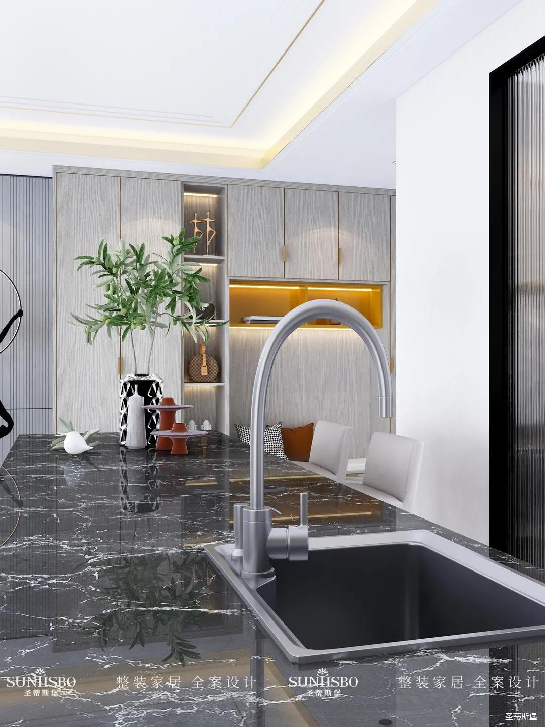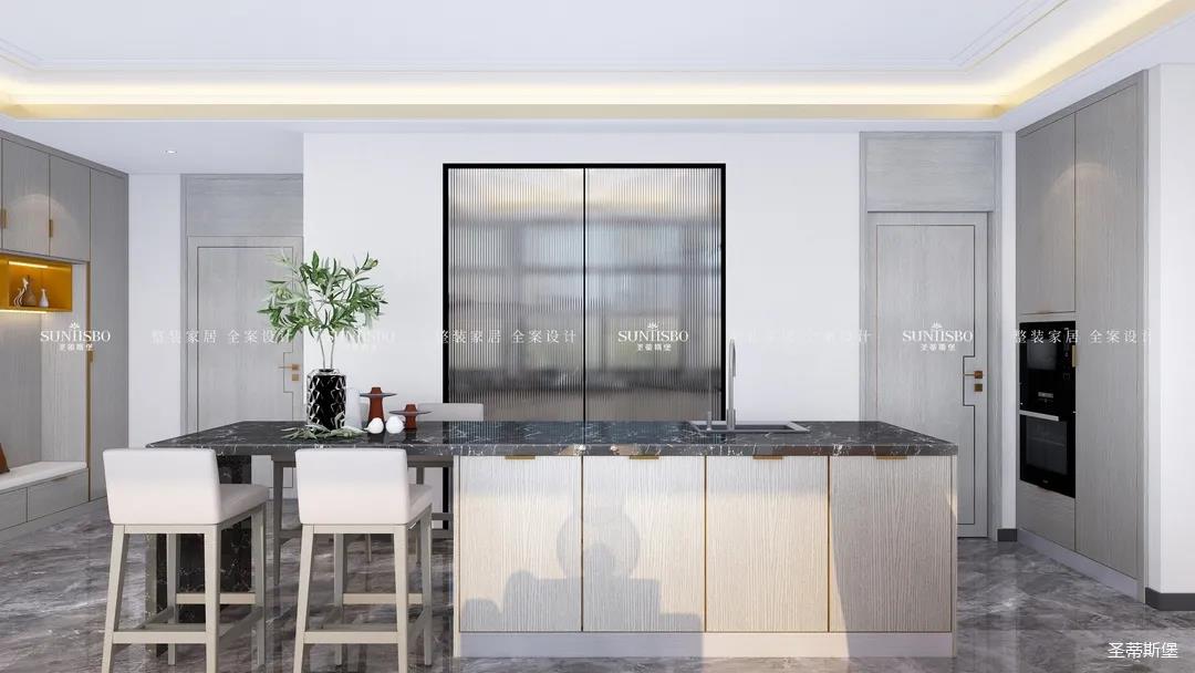 設(shè)計(jì)師以廚房&西廚區(qū)為布局的中軸,打開左右空間,延伸出廚房動(dòng)線功能區(qū),增加西廚區(qū)域,有效延伸空間。設(shè)計(jì)師打造了下午茶專屬的中島臺(tái),中島臺(tái)與客廳串連,方便屋主隨時(shí)分享美食樂趣。