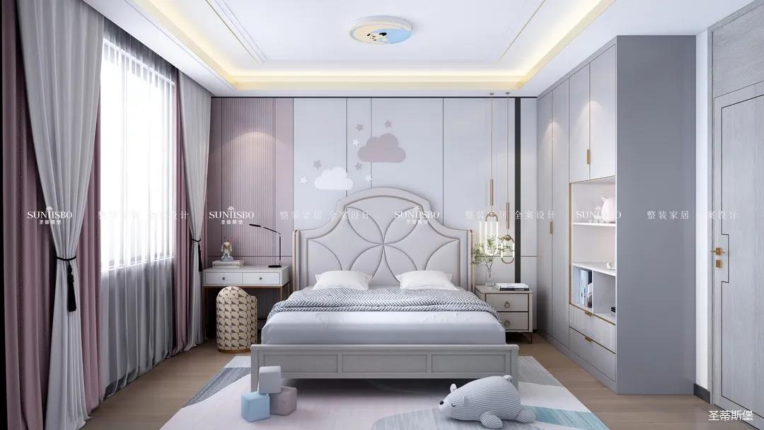 兒童房以粉白為基調(diào),醞釀著世間充滿童真和浪漫的語言。四照花型的床屏,讓人聯(lián)想到被粉色鮮花包圍的公主王國(guó)。封閉式的收納衣柜增加了開放式的兒童玩偶展示區(qū),溫馨又浪漫,讓小孩在童話王國(guó)里長(zhǎng)大。