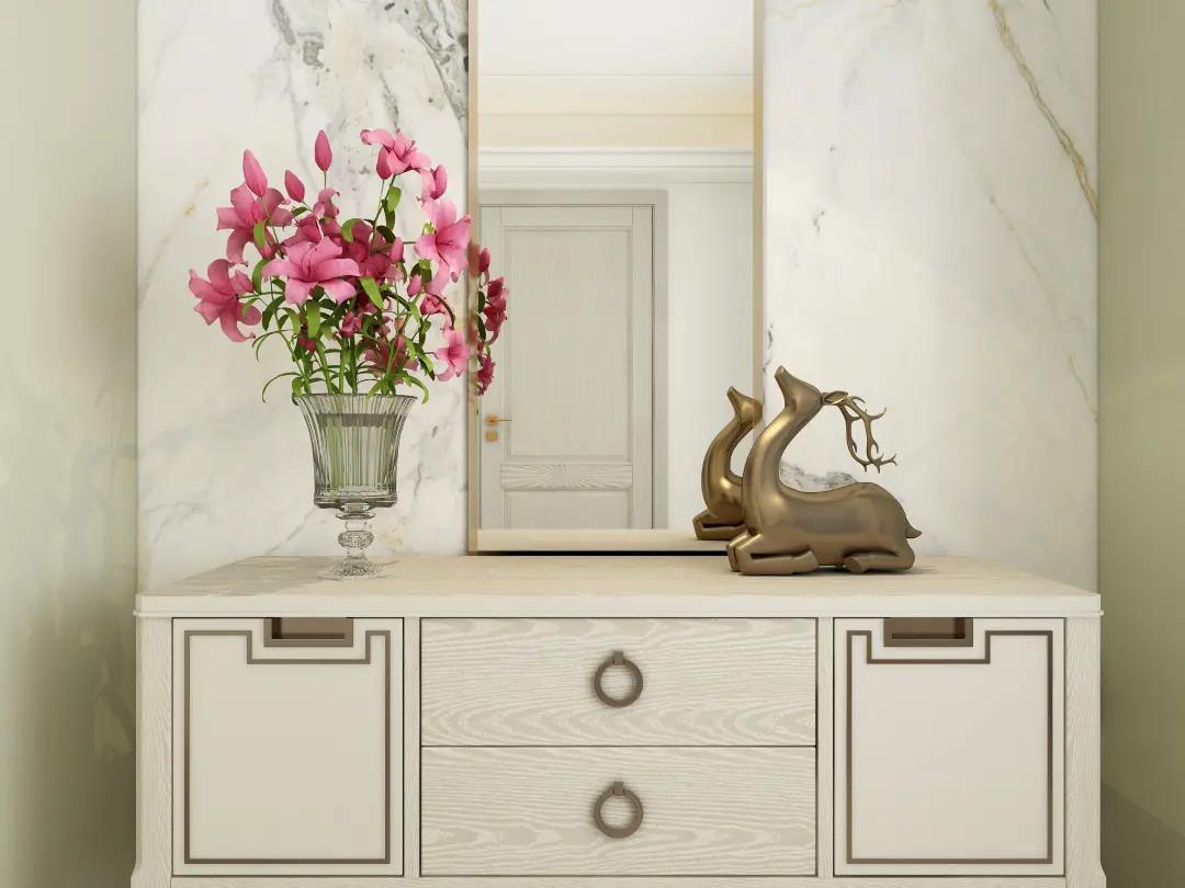 正前方是藝術大理石搭配仿古白移動玄關柜,