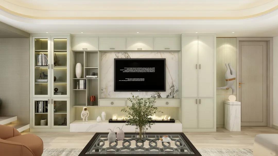 背景墻區(qū)域透過定制柜的材質紋理、立面線條、