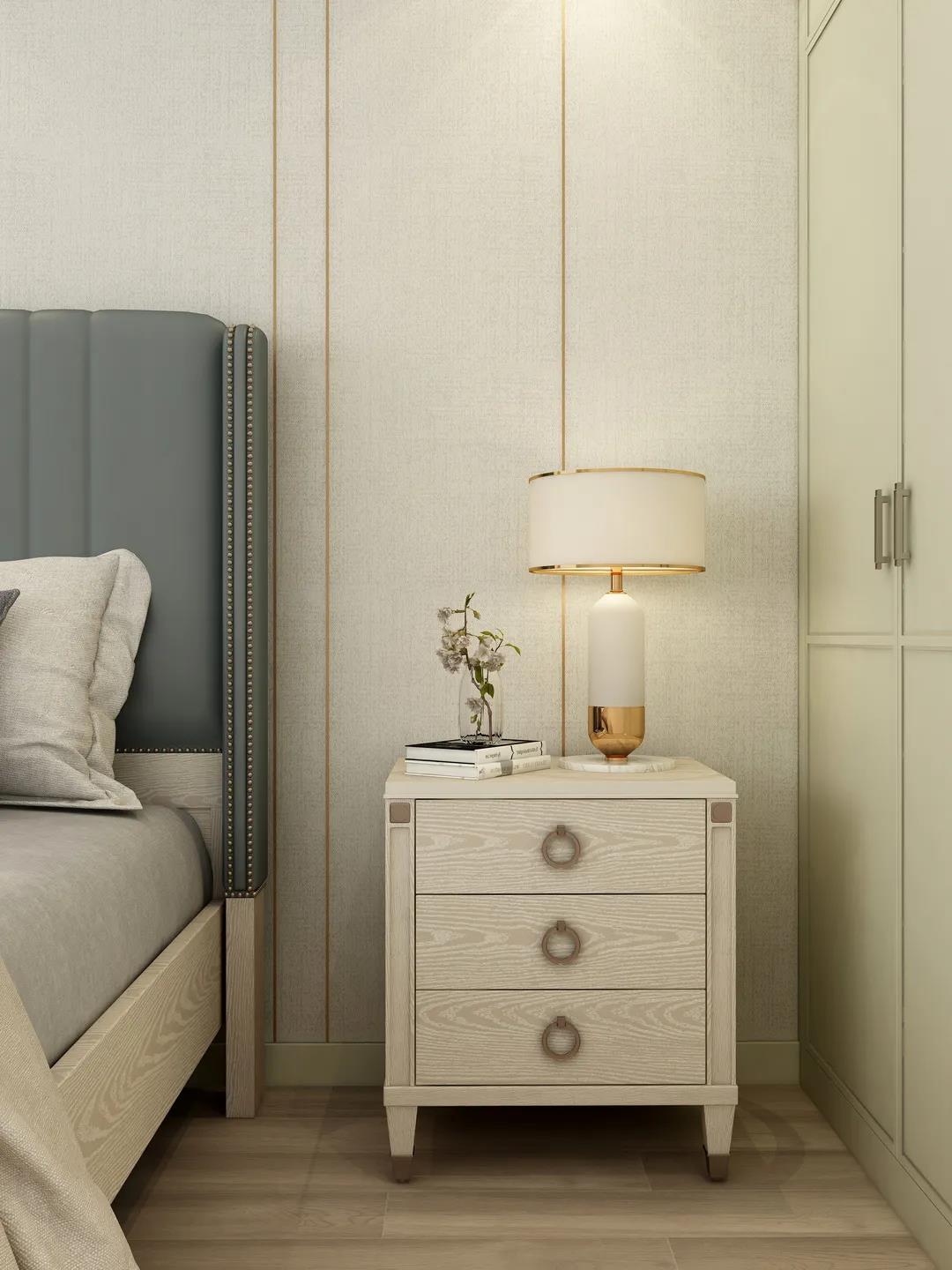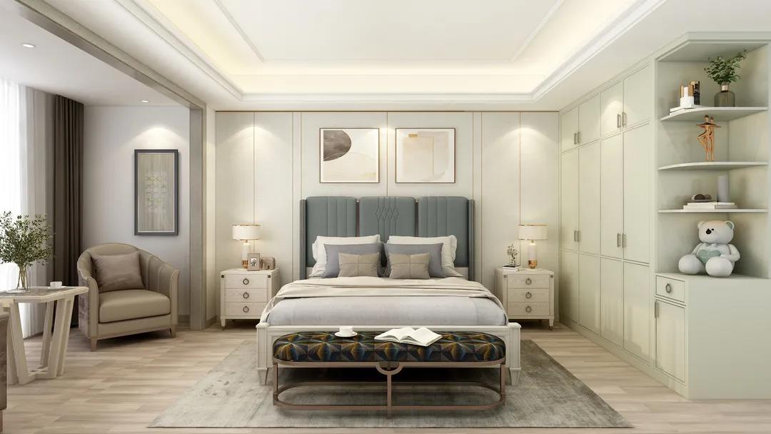 次臥背景墻兩端是對稱式設計,以淡雅的暖色為主,