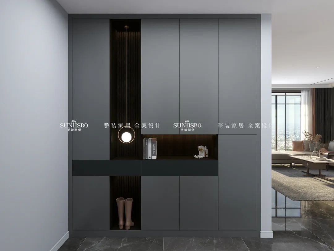 入口玄關(guān)處講究極致簡潔,摒棄繁雜的設(shè)計元素,地面磚體采用與柜體相近的色調(diào),在界面轉(zhuǎn)折的地方著重連貫統(tǒng)一,讓入戶空間呈現(xiàn)科技立體感,趣味十足的藝術(shù)品擺放,使整體顯得高級又有顏值。在其中通過點(diǎn)狀燈光設(shè)計,帶來躍動而富有生命力的視覺焦點(diǎn),展現(xiàn)出現(xiàn)代時尚感。