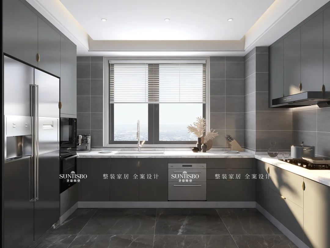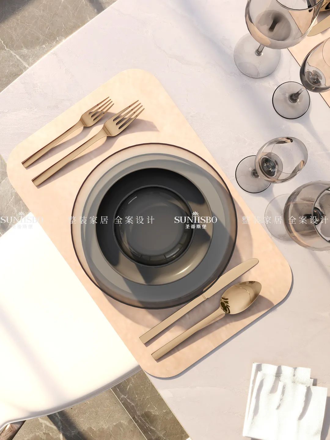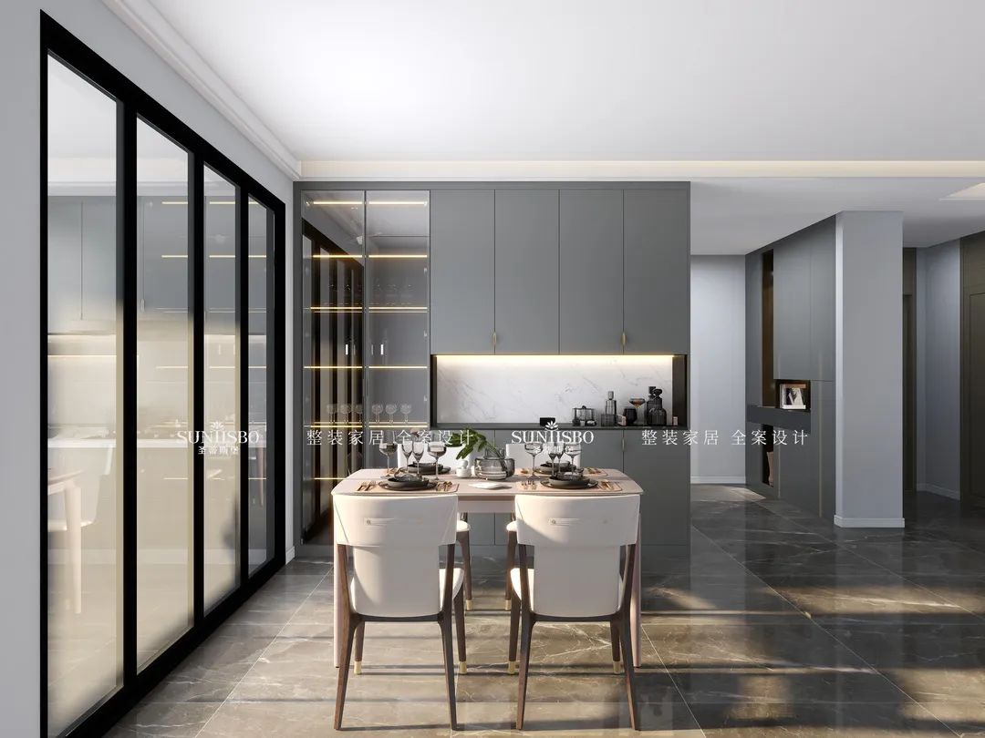 餐廳的設(shè)計采用整墻定制的餐邊柜,高級灰讓空間調(diào)性瞬間得到提升,半透明的玻璃展示區(qū),營造了多樣的空間和充滿極簡藝術(shù)氣息的生活體驗(yàn)。