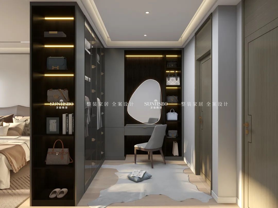 擁有一個專屬衣帽間是很多女生的夢想。設(shè)計師回歸生活本質(zhì),究其外,是空間;究其內(nèi),是材質(zhì)、燈光,內(nèi)外融合,比例和諧。通過不規(guī)則狀的玻璃鏡面設(shè)計,在時尚高級的定制空間中,傾訴著創(chuàng)意的真實(shí)和溫度,不僅擴(kuò)大了衣帽間視覺范圍,同時也給予了空間個性鮮明的藝術(shù)格調(diào)。